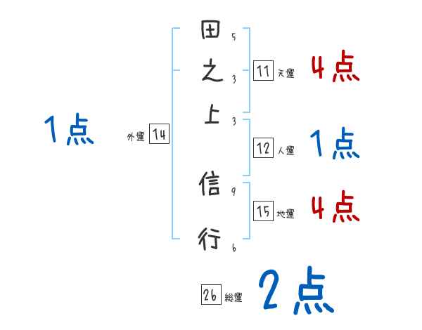 外運![]() | 田之上信行さんの外運は14画の1つ星!人に対して優しいがストレスを溜め込みがち。人間関係のトラブルを避けるよう気をつけましょう。 生活面を象徴する運勢です。外部から受ける影響力を表し、結婚運、家庭運や職場、環境への順応性を表します。 |
