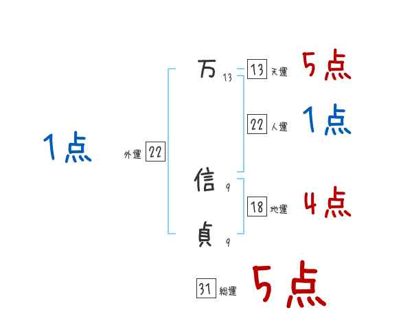外運![]() | 万信貞さんの外運は22画の1つ星!努力することが苦手ないっぽう手先が器用。芸術性にも優れる。 生活面を象徴する運勢です。外部から受ける影響力を表し、結婚運、家庭運や職場、環境への順応性を表します。 |