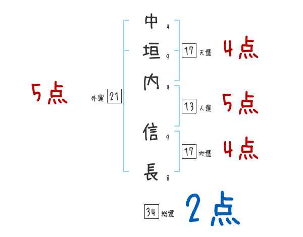 総運![]() | 中垣内信長さんの総運は34画の2つ星!独創性に優れるが、自尊心が強く災難に注意しましょう。 あなたの人生を表す1番重要な運勢です。生涯を通じて影響する総合運となり、主に50歳以降の晩年期に影響を及ぼします。 |