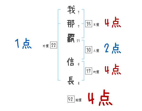 天運![]() | 我那覇信長さんの天運は35画の4つ星!温厚な性格で感受性が高い。穏和な性格で人望が厚い。 家系が持つ宿命的な運勢を表します。祖先から受け継いだ苗字ですので自分の力が及びません。家柄を象徴します。 |