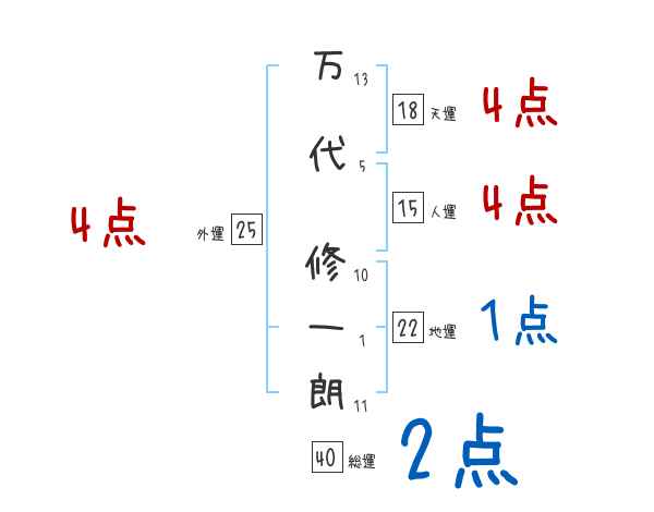 天運![]() | 万代修一朗さんの天運は18画の4つ星!情熱的で剛気。忍耐力があり信頼される。 家系が持つ宿命的な運勢を表します。祖先から受け継いだ苗字ですので自分の力が及びません。家柄を象徴します。 |