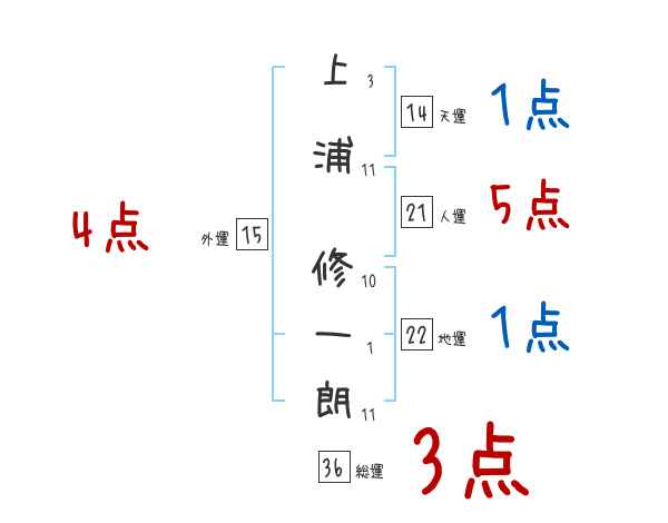 天運![]() | 上浦修一朗さんの天運は14画の1つ星!人に対して優しいがストレスを溜め込みがち。人間関係のトラブルを避けるよう気をつけましょう。 家系が持つ宿命的な運勢を表します。祖先から受け継いだ苗字ですので自分の力が及びません。家柄を象徴します。 |