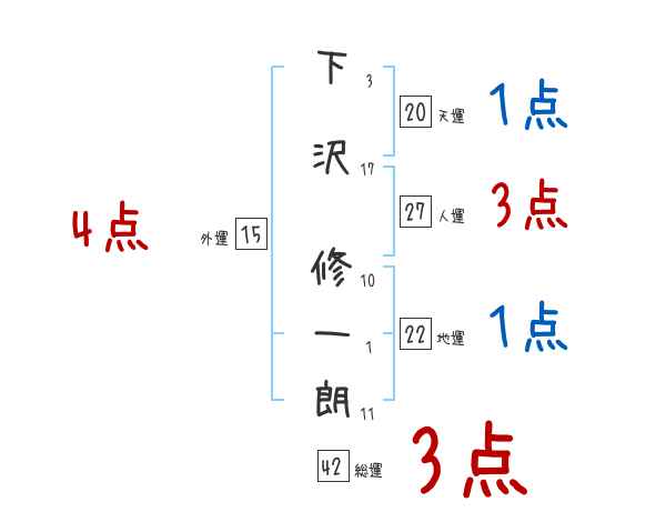 地運![]() | 下沢修一朗さんの地運は22画の1つ星!努力することが苦手ないっぽう手先が器用。芸術性にも優れる。 個性を表す基礎的な運勢です。性格形成や対人関係、行動力など家庭環境に影響されます。主に誕生してから20歳くらいまでの若年期の運勢を表します。 |