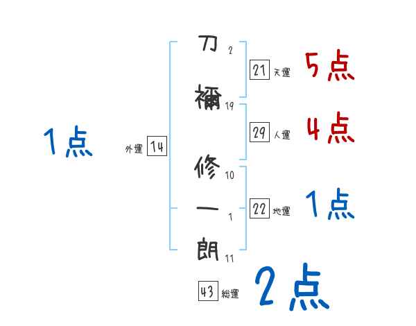 天運![]() | 刀禰修一朗さんの天運は21画の5つ星!統率力がある。独立し成功する。名誉を手に入れる。 家系が持つ宿命的な運勢を表します。祖先から受け継いだ苗字ですので自分の力が及びません。家柄を象徴します。 |