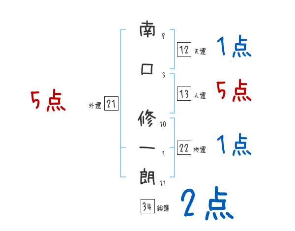 天運![]() | 南口修一朗さんの天運は12画の1つ星!簡単な失敗で諦めてしまいやすいかも。着実に行動すると良いでしょう。 家系が持つ宿命的な運勢を表します。祖先から受け継いだ苗字ですので自分の力が及びません。家柄を象徴します。 |