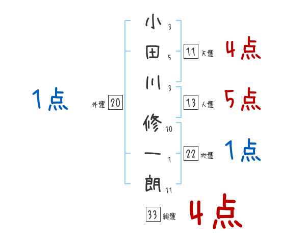 天運![]() | 小田川修一朗さんの天運は11画の4つ星!着実に富や地位を得る幸運な人生。 家系が持つ宿命的な運勢を表します。祖先から受け継いだ苗字ですので自分の力が及びません。家柄を象徴します。 |