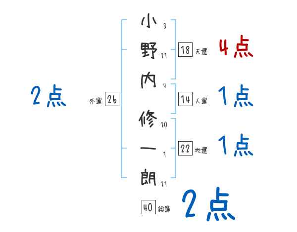 天運![]() | 小野内修一朗さんの天運は18画の4つ星!情熱的で剛気。忍耐力があり信頼される。 家系が持つ宿命的な運勢を表します。祖先から受け継いだ苗字ですので自分の力が及びません。家柄を象徴します。 |