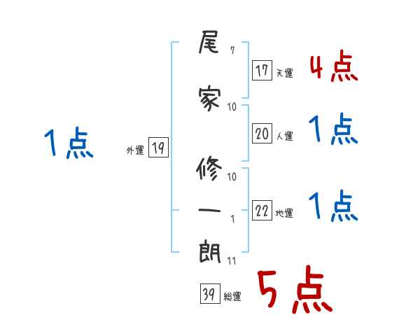外運![]() | 尾家修一朗さんの外運は19画の1つ星!優れた才能を持ちますが、協調性が足りないことも。周りの人と協力する事を意識しましょう。 生活面を象徴する運勢です。外部から受ける影響力を表し、結婚運、家庭運や職場、環境への順応性を表します。 |