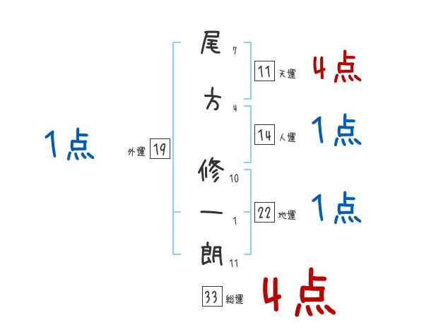 天運![]() | 尾方修一朗さんの天運は11画の4つ星!着実に富や地位を得る幸運な人生。 家系が持つ宿命的な運勢を表します。祖先から受け継いだ苗字ですので自分の力が及びません。家柄を象徴します。 |
