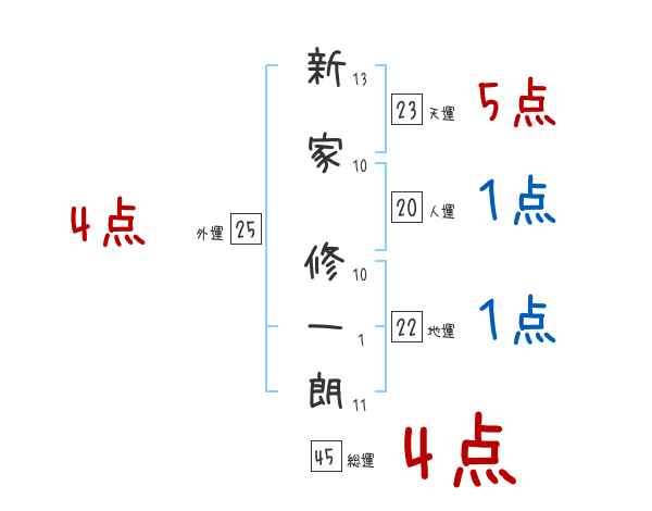 天運![]() | 新家修一朗さんの天運は23画の5つ星!想像力に優れ活力がある。一代で成功し名誉を手に入れる。 家系が持つ宿命的な運勢を表します。祖先から受け継いだ苗字ですので自分の力が及びません。家柄を象徴します。 |
