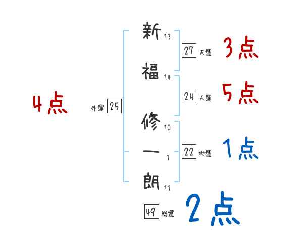 天運![]() | 新福修一朗さんの天運は27画の3つ星!頭脳明晰だが強情で摩擦が多い傾向。孤立に注意。 家系が持つ宿命的な運勢を表します。祖先から受け継いだ苗字ですので自分の力が及びません。家柄を象徴します。 |