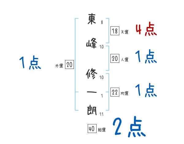 天運![]() | 東峰修一朗さんの天運は18画の4つ星!情熱的で剛気。忍耐力があり信頼される。 家系が持つ宿命的な運勢を表します。祖先から受け継いだ苗字ですので自分の力が及びません。家柄を象徴します。 |