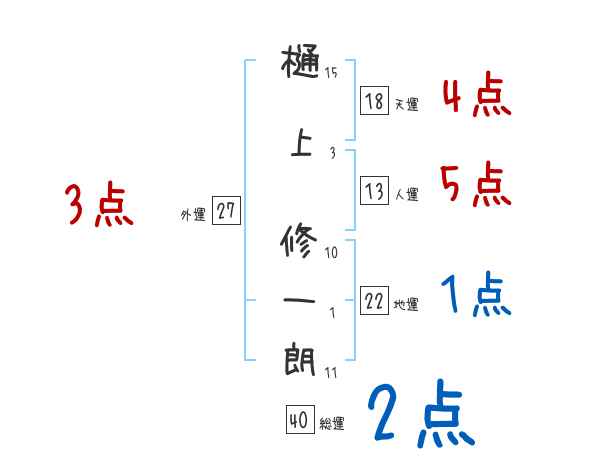 天運![]() | 樋上修一朗さんの天運は18画の4つ星!情熱的で剛気。忍耐力があり信頼される。 家系が持つ宿命的な運勢を表します。祖先から受け継いだ苗字ですので自分の力が及びません。家柄を象徴します。 |