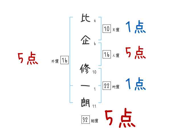 外運![]() | 比企修一朗さんの外運は16画の5つ星!人望が厚く大きく発展する。逆転成功が見える。 生活面を象徴する運勢です。外部から受ける影響力を表し、結婚運、家庭運や職場、環境への順応性を表します。 |