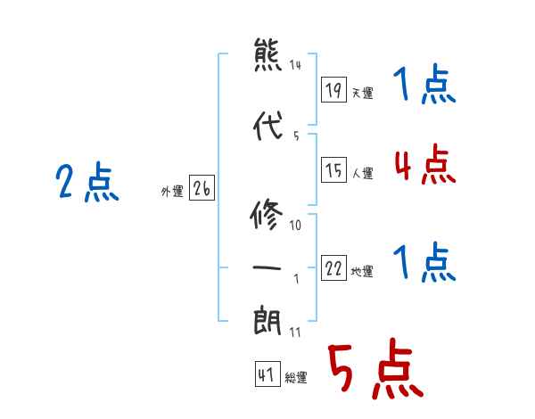 天運![]() | 熊代修一朗さんの天運は19画の1つ星!優れた才能を持ちますが、協調性が足りないことも。周りの人と協力する事を意識しましょう。 家系が持つ宿命的な運勢を表します。祖先から受け継いだ苗字ですので自分の力が及びません。家柄を象徴します。 |
