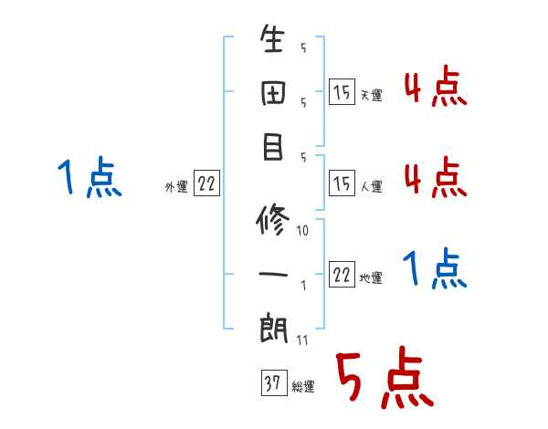 地運![]() | 生田目修一朗さんの地運は22画の1つ星!努力することが苦手ないっぽう手先が器用。芸術性にも優れる。 個性を表す基礎的な運勢です。性格形成や対人関係、行動力など家庭環境に影響されます。主に誕生してから20歳くらいまでの若年期の運勢を表します。 |