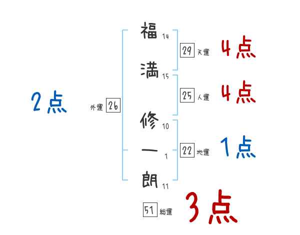 外運![]() | 福満修一朗さんの外運は26画の2つ星!波瀾万丈かも。信頼できる人を大事にしましょう。 生活面を象徴する運勢です。外部から受ける影響力を表し、結婚運、家庭運や職場、環境への順応性を表します。 |