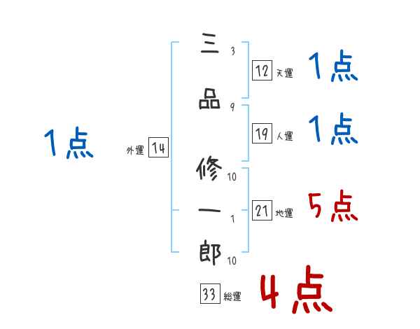 外運![]() | 三品修一郎さんの外運は14画の1つ星!人に対して優しいがストレスを溜め込みがち。人間関係のトラブルを避けるよう気をつけましょう。 生活面を象徴する運勢です。外部から受ける影響力を表し、結婚運、家庭運や職場、環境への順応性を表します。 |