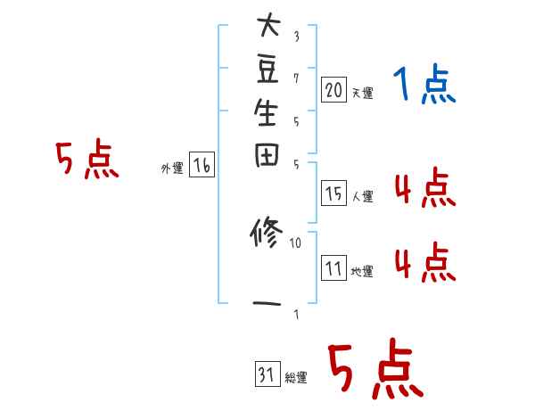 外運![]() | 大豆生田修一さんの外運は16画の5つ星!人望が厚く大きく発展する。逆転成功が見える。 生活面を象徴する運勢です。外部から受ける影響力を表し、結婚運、家庭運や職場、環境への順応性を表します。 |