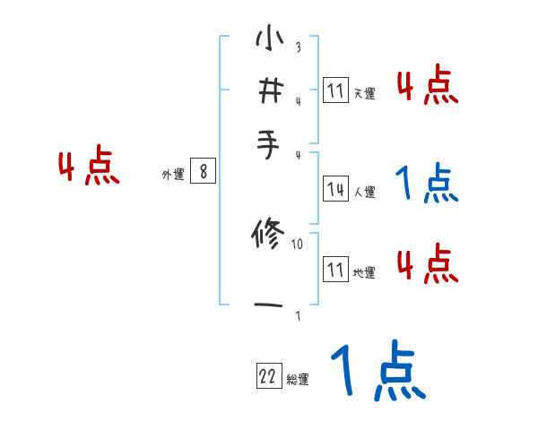 天運![]() | 小井手修一さんの天運は11画の4つ星!着実に富や地位を得る幸運な人生。 家系が持つ宿命的な運勢を表します。祖先から受け継いだ苗字ですので自分の力が及びません。家柄を象徴します。 |
