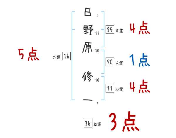 外運![]() | 日野原修一さんの外運は16画の5つ星!人望が厚く大きく発展する。逆転成功が見える。 生活面を象徴する運勢です。外部から受ける影響力を表し、結婚運、家庭運や職場、環境への順応性を表します。 |