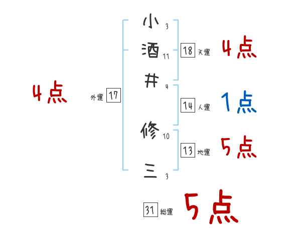 外運![]() | 小酒井修三さんの外運は17画の4つ星!積極的な行動力。地位を気づき財産を手に入れる。純粋な心と直感力。 生活面を象徴する運勢です。外部から受ける影響力を表し、結婚運、家庭運や職場、環境への順応性を表します。 |