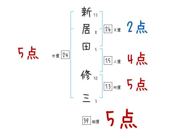 総運![]() | 新居田修三さんの総運は39画の5つ星!社交性に優れ人望が厚い。人の上に立ち成功する。 あなたの人生を表す1番重要な運勢です。生涯を通じて影響する総合運となり、主に50歳以降の晩年期に影響を及ぼします。 |
