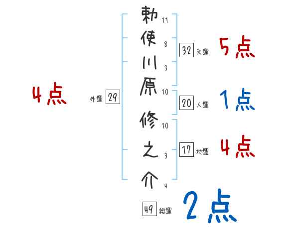 天運![]() | 勅使川原修之介さんの天運は32画の5つ星!柔軟性があり成功する。チャンスが多く金運が良い。 家系が持つ宿命的な運勢を表します。祖先から受け継いだ苗字ですので自分の力が及びません。家柄を象徴します。 |