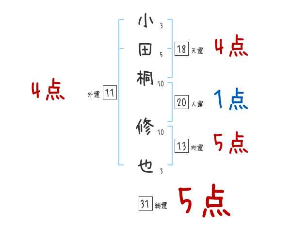 外運![]() | 小田桐修也さんの外運は11画の4つ星!着実に富や地位を得る幸運な人生。 生活面を象徴する運勢です。外部から受ける影響力を表し、結婚運、家庭運や職場、環境への順応性を表します。 |