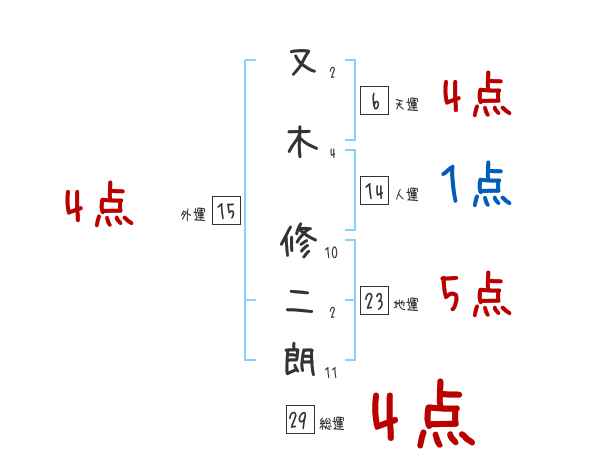 外運![]() | 又木修二朗さんの外運は15画の4つ星!人徳があり出世する。順調に物事を進め円満な人生。 生活面を象徴する運勢です。外部から受ける影響力を表し、結婚運、家庭運や職場、環境への順応性を表します。 |