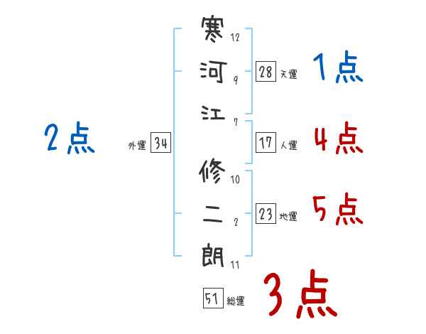 天運![]() | 寒河江修二朗さんの天運は28画の1つ星!家庭環境に注意。スポーツで活躍できる能力があるかも。 家系が持つ宿命的な運勢を表します。祖先から受け継いだ苗字ですので自分の力が及びません。家柄を象徴します。 |