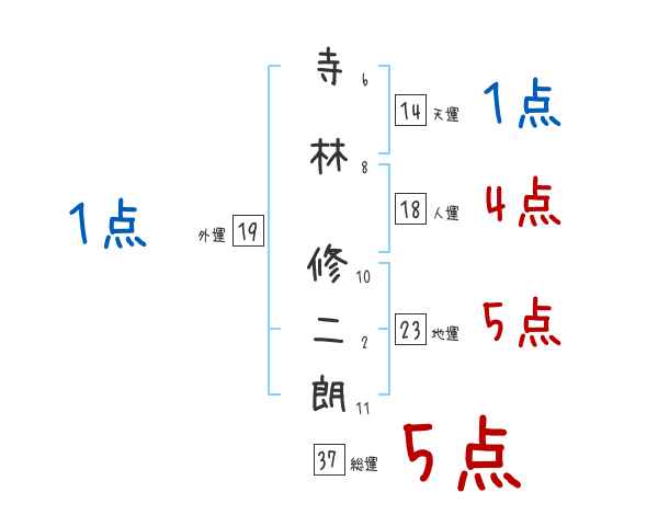 外運![]() | 寺林修二朗さんの外運は19画の1つ星!優れた才能を持ちますが、協調性が足りないことも。周りの人と協力する事を意識しましょう。 生活面を象徴する運勢です。外部から受ける影響力を表し、結婚運、家庭運や職場、環境への順応性を表します。 |