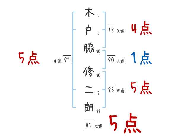 外運![]() | 木戸脇修二朗さんの外運は21画の5つ星!統率力がある。独立し成功する。名誉を手に入れる。 生活面を象徴する運勢です。外部から受ける影響力を表し、結婚運、家庭運や職場、環境への順応性を表します。 |