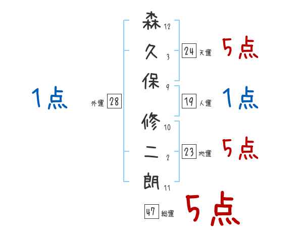 総運![]() | 森久保修二朗さんの総運は47画の5つ星!実力が開花し発展する円満な人生。財に恵まれる。 あなたの人生を表す1番重要な運勢です。生涯を通じて影響する総合運となり、主に50歳以降の晩年期に影響を及ぼします。 |