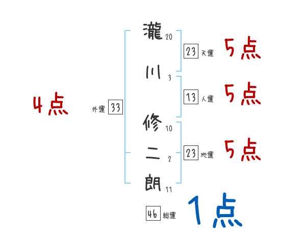 天運![]() | 瀧川修二朗さんの天運は23画の5つ星!想像力に優れ活力がある。一代で成功し名誉を手に入れる。 家系が持つ宿命的な運勢を表します。祖先から受け継いだ苗字ですので自分の力が及びません。家柄を象徴します。 |