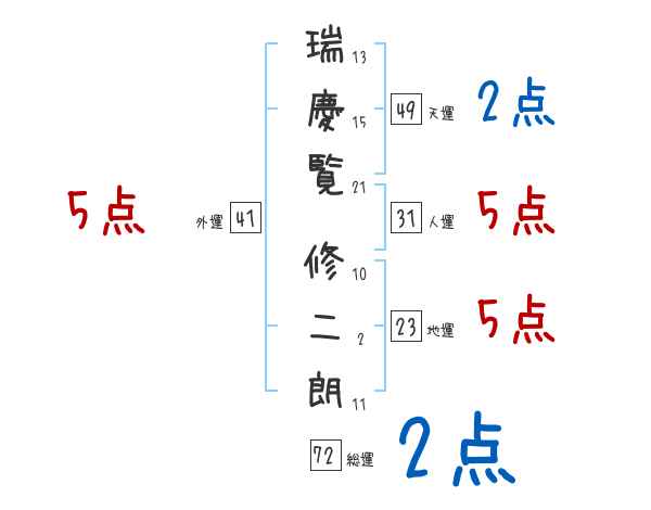 天運![]() | 瑞慶覧修二朗さんの天運は49画の2つ星!不安定な性格で明暗がある人生。周りの人には支援されやすい。 家系が持つ宿命的な運勢を表します。祖先から受け継いだ苗字ですので自分の力が及びません。家柄を象徴します。 |