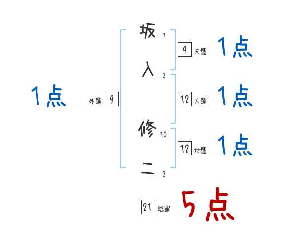 天運![]() | 坂入修二さんの天運は9画の1つ星!消極的で才能を発揮することが苦手なことも。周りの意見に耳を傾けましょう。 家系が持つ宿命的な運勢を表します。祖先から受け継いだ苗字ですので自分の力が及びません。家柄を象徴します。 |