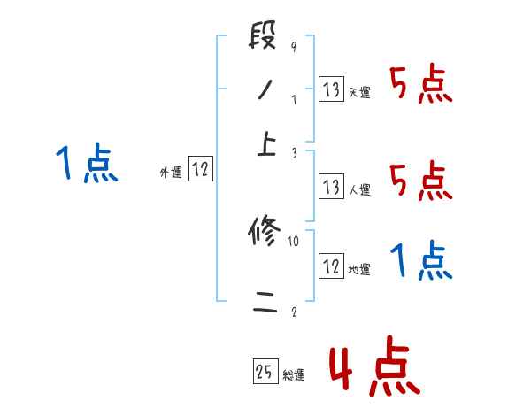 人運![]() | 段ノ上修二さんの人運は13画の5つ星!才能に恵まれ人気がある。名声を手に入れる。円満な人生。 性格や才能などを表す2番目に重要な運勢です。人間関係や協調性、社会的な成功に影響します。主に20歳から50歳ぐらいまでの中年期の運勢を表します。 |