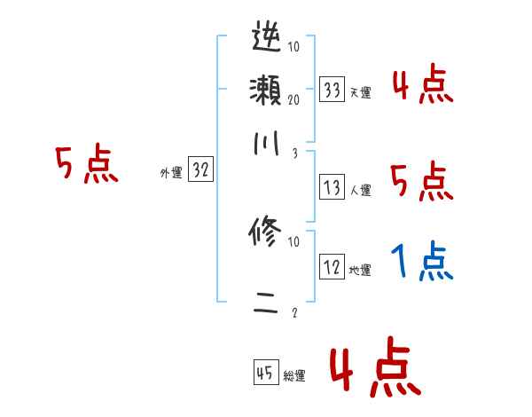 外運![]() | 逆瀬川修二さんの外運は32画の5つ星!柔軟性があり成功する。チャンスが多く金運が良い。 生活面を象徴する運勢です。外部から受ける影響力を表し、結婚運、家庭運や職場、環境への順応性を表します。 |