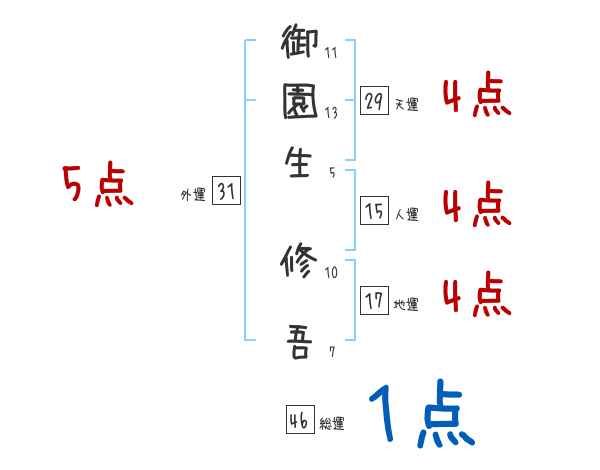 総運![]() | 御園生修吾さんの総運は46画の1つ星!迷走することが多く苦労するかも。目先のことにとらわれないように。 あなたの人生を表す1番重要な運勢です。生涯を通じて影響する総合運となり、主に50歳以降の晩年期に影響を及ぼします。 |