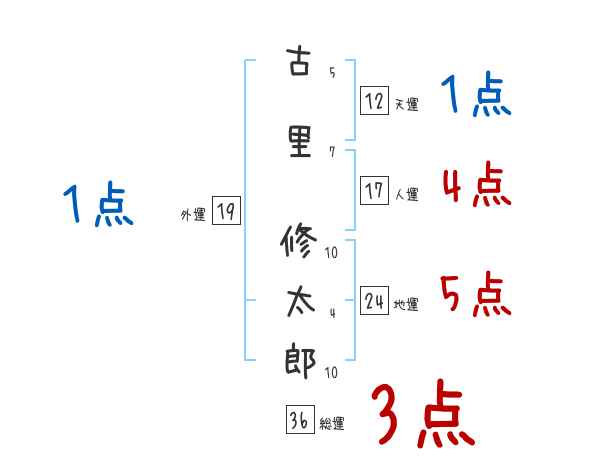 天運![]() | 古里修太郎さんの天運は12画の1つ星!簡単な失敗で諦めてしまいやすいかも。着実に行動すると良いでしょう。 家系が持つ宿命的な運勢を表します。祖先から受け継いだ苗字ですので自分の力が及びません。家柄を象徴します。 |
