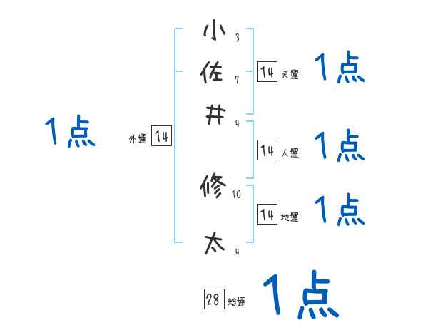 天運![]() | 小佐井修太さんの天運は14画の1つ星!人に対して優しいがストレスを溜め込みがち。人間関係のトラブルを避けるよう気をつけましょう。 家系が持つ宿命的な運勢を表します。祖先から受け継いだ苗字ですので自分の力が及びません。家柄を象徴します。 |