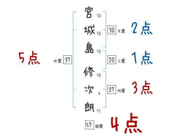 総運![]() | 宮城島修次朗さんの総運は57画の4つ星!向上心があり人望がある。地位を得る。 あなたの人生を表す1番重要な運勢です。生涯を通じて影響する総合運となり、主に50歳以降の晩年期に影響を及ぼします。 |
