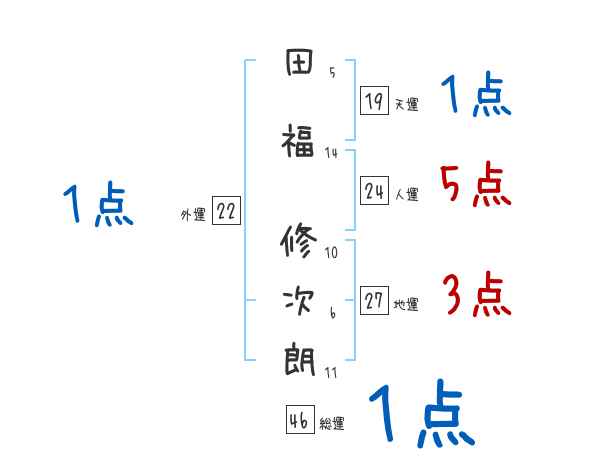 天運![]() | 田福修次朗さんの天運は19画の1つ星!優れた才能を持ちますが、協調性が足りないことも。周りの人と協力する事を意識しましょう。 家系が持つ宿命的な運勢を表します。祖先から受け継いだ苗字ですので自分の力が及びません。家柄を象徴します。 |