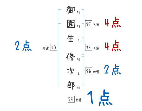 外運![]() | 御園生修次郎さんの外運は40画の2つ星!自信過剰で物事に固執するためトラブルに注意。 生活面を象徴する運勢です。外部から受ける影響力を表し、結婚運、家庭運や職場、環境への順応性を表します。 |