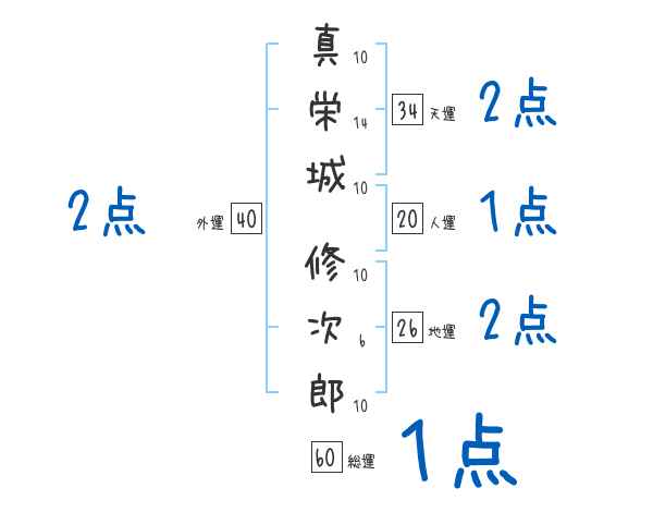総運![]() | 真栄城修次郎さんの総運は60画の1つ星!悲観的で迷いやすい。波乱が多く損をしないように。 あなたの人生を表す1番重要な運勢です。生涯を通じて影響する総合運となり、主に50歳以降の晩年期に影響を及ぼします。 |