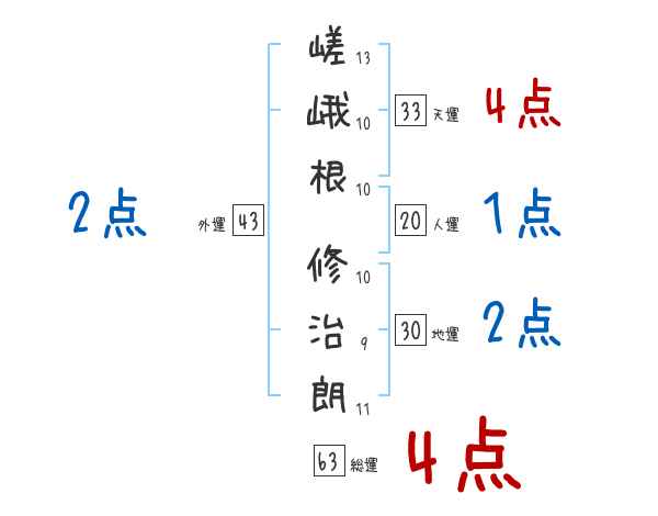 天運![]() | 嵯峨根修治朗さんの天運は33画の4つ星!権力志向でプライドが高い。勇気があり運を切り開き成功する。 家系が持つ宿命的な運勢を表します。祖先から受け継いだ苗字ですので自分の力が及びません。家柄を象徴します。 |