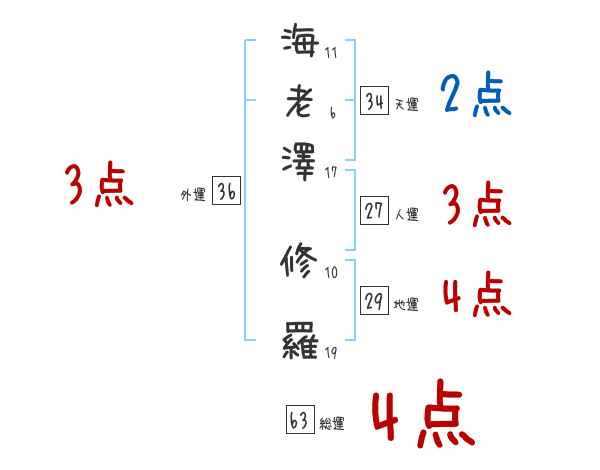 総運![]() | 海老澤修羅さんの総運は63画の4つ星!家庭運がよく順調な生活。温和な性格。 あなたの人生を表す1番重要な運勢です。生涯を通じて影響する総合運となり、主に50歳以降の晩年期に影響を及ぼします。 |