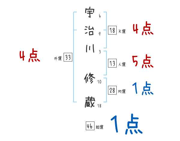 総運![]() | 宇治川修蔵さんの総運は46画の1つ星!迷走することが多く苦労するかも。目先のことにとらわれないように。 あなたの人生を表す1番重要な運勢です。生涯を通じて影響する総合運となり、主に50歳以降の晩年期に影響を及ぼします。 |