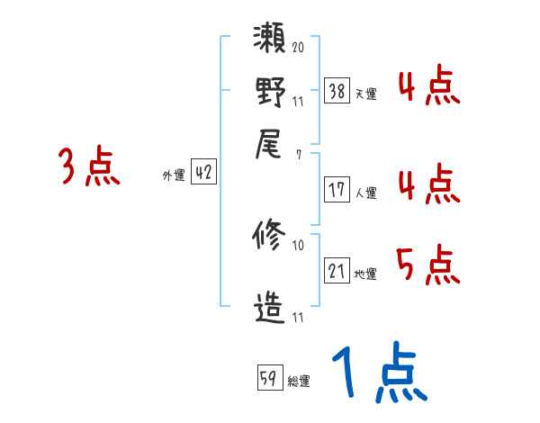 人運![]() | 瀬野尾修造さんの人運は17画の4つ星!積極的な行動力。地位を気づき財産を手に入れる。純粋な心と直感力。 性格や才能などを表す2番目に重要な運勢です。人間関係や協調性、社会的な成功に影響します。主に20歳から50歳ぐらいまでの中年期の運勢を表します。 |